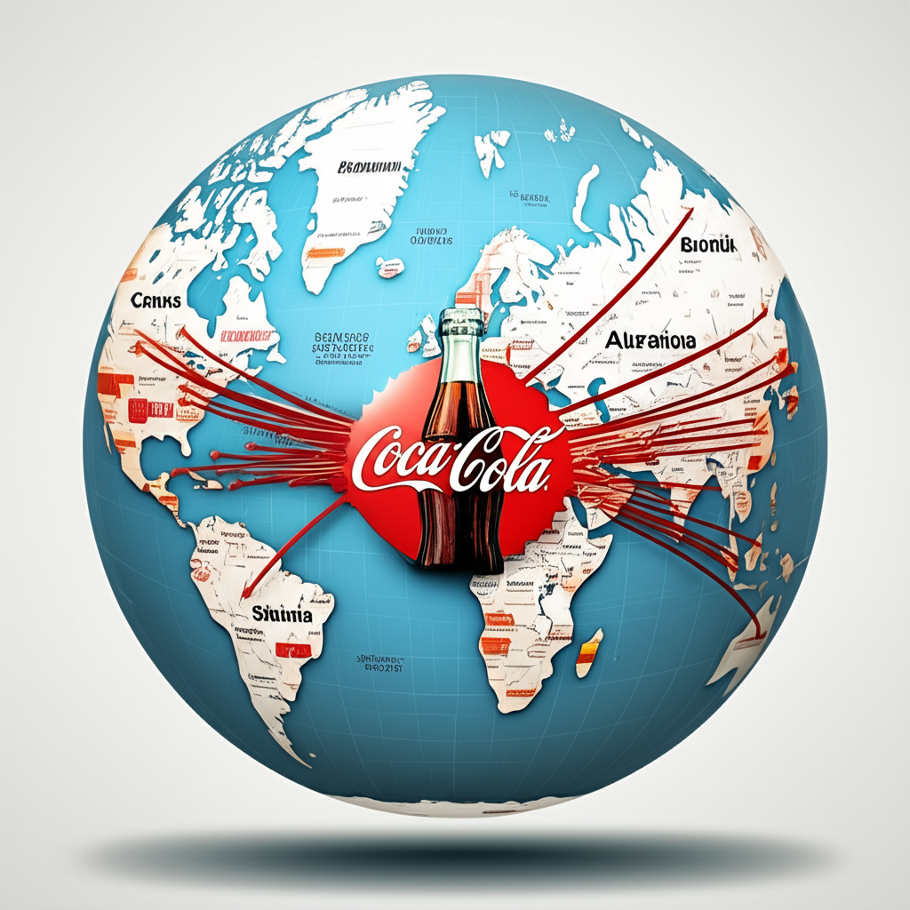 可口可樂標誌與經典瓶子浮現世界地圖,周圍環繞多元產品品牌,象徵全球影響力與產品組合