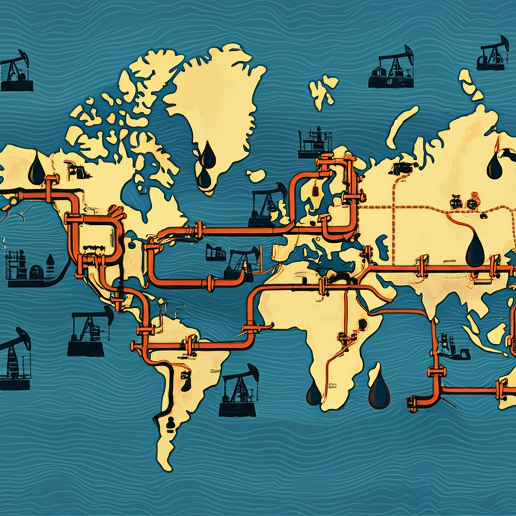 全球原油網絡圖示,展示管道與油井連結各大洲,象徵原油對經濟與地緣政治的影響