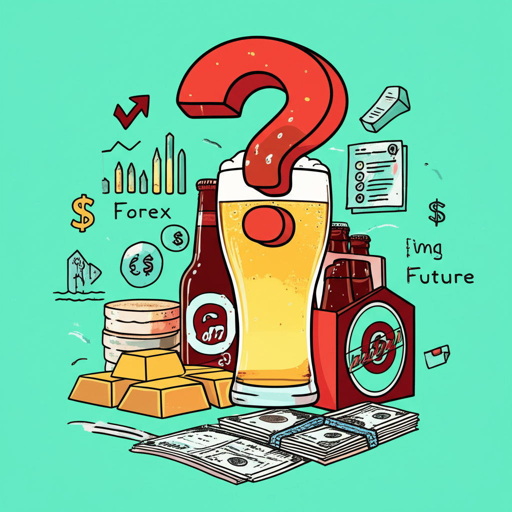 多元金融資產如股票、外匯、黃金與期貨,搭配一組啤酒代表日常生活,中央以問號象徵一手的多重定義